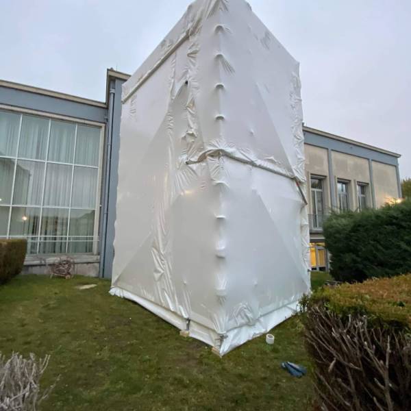 Les protections thermocollées, généralement sous forme de films ou de revêtements spécifiques, sont fixés sur les échafaudages. Ces protections sont donc intégrées à la structure métallique, créant une barrière robuste contre les intempéries, mais les revêtements thermocollés peuvent également avoir des propriétés isolantes, permettant la retenue de particules ou de poussières.